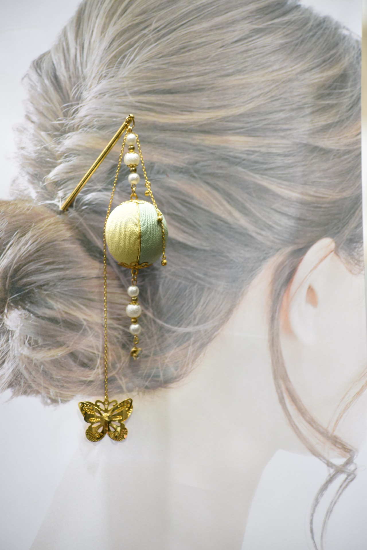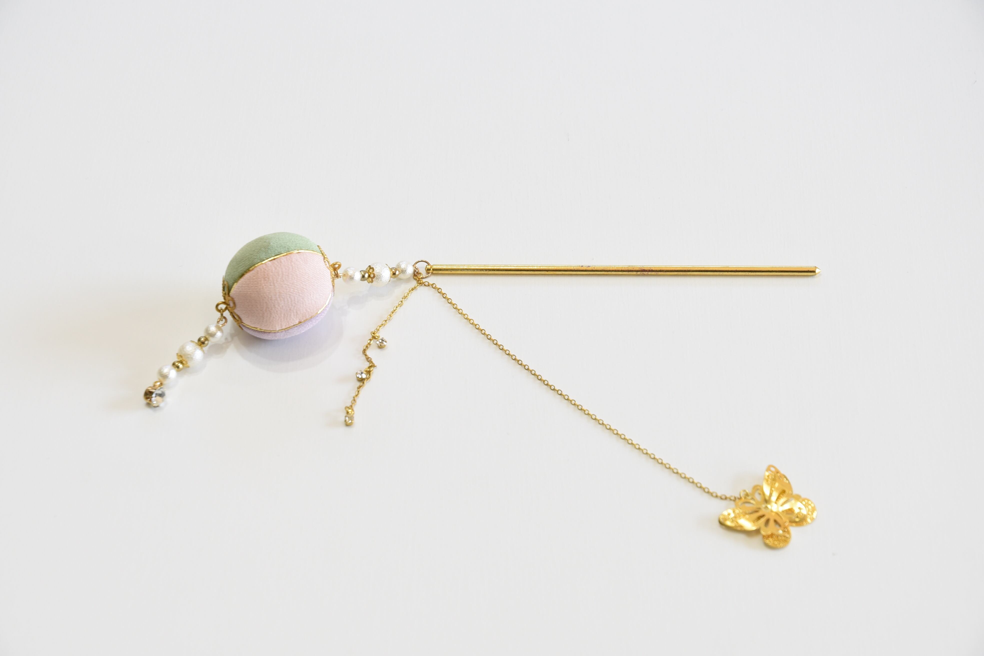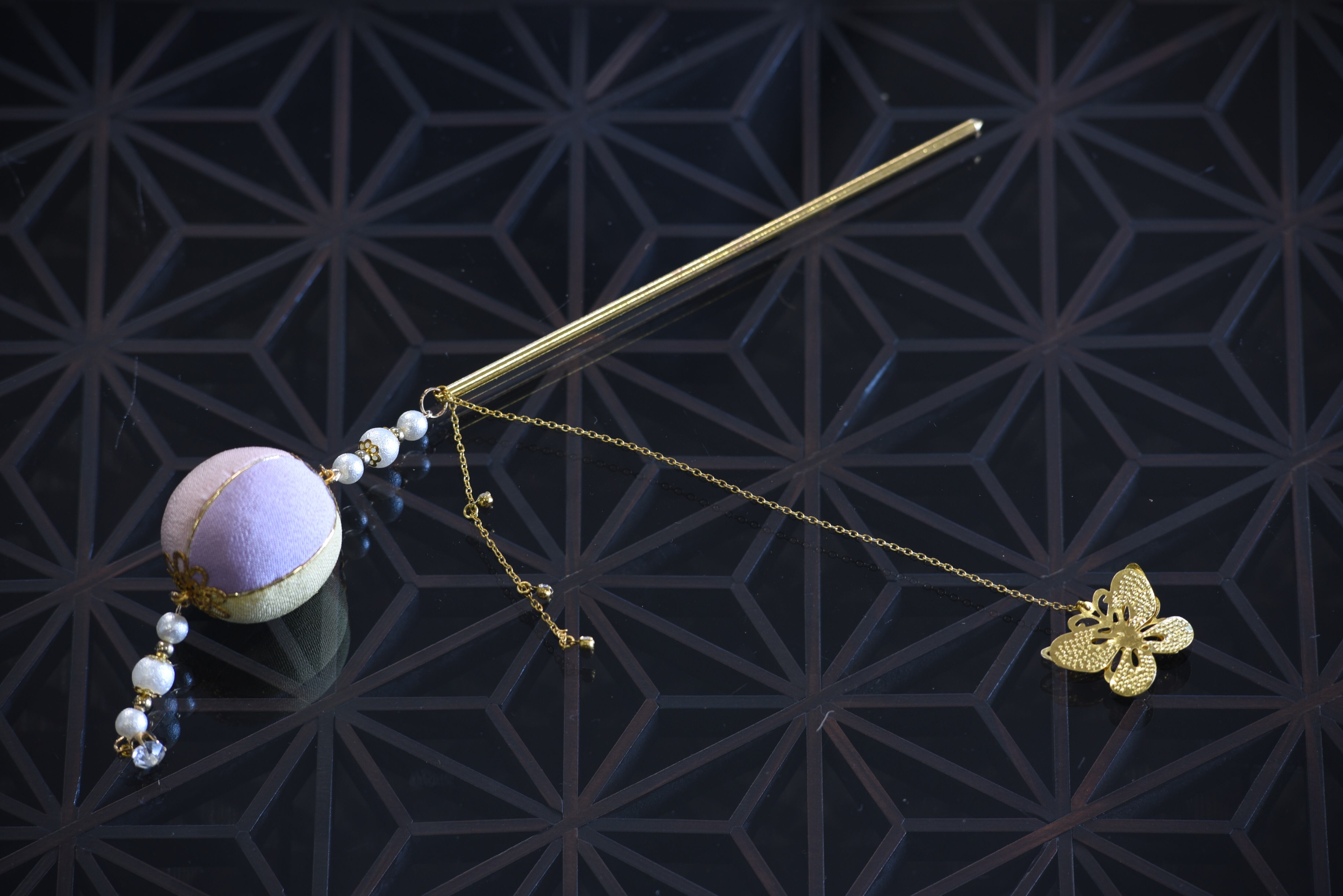 黄色、翠、ピンク、紫の色合わせの簪。